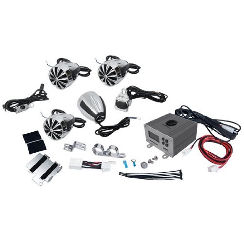 The OPTIMC92 weatherproof speaker system is what you need to listen to high-quality auto on your motorcycle, ATV, or snowmobile. It comes with four 3-Inch bullet-style 50-watt weatherproof speakers and a 1400-watt amplifier for complete immersion in your music. Plug your MP3 player or iPod into the included 3.5mm jack to listen to your favorite music on this stylish system. Charge your MP3 player with the satellite USB plug (USB for charging only). Listen to your favorite radio stations with the FM radio. Easy handlebar mounting brackets and accessories are included to make installation a quick process. Now you can listen to music on the go, anywhere -thanks to Lanzars OPTI speakers and amplifiers.