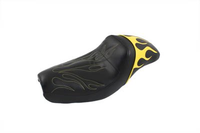 Yellow flame style gunfighter seat features sewn inlay of colored flames on rear pad area with matching flame stitch and thread in front driver area. Order bracket separately. Fits:XL 2004-2006 UOM: 1 - EA Style: Gunfighter 2011 Catalog pages: 961 Order #31-0653 bracket SAV for Harley Davidson Motorcycles