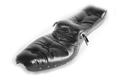 Hustler seat is classic pillow style and features a metal baseplate with full foam and vinyl cover. Seat has chrome spots around the sides of both front and rear seat. Conchas have leather ties. Seat includes rear bolt for direct fender mount. Fits:XL 1952-1978 UOM: 1 - EA Style: Hustler 2011 Catalog pages: 965 SAV for Harley Davidson Motorcycles