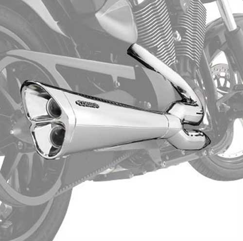 This kit meets the SAE J2825 stationary sound test standard. Add some muscle to a bike's exhaust note and allow the Freedom engine to breathe more freely with this 2-into-1 Stage 1 exhaust system. The styling is outstanding, with the two headers feeding into the unique, distinctively-styled triangular canister that gives the bike an eye-catching performance look. This premium exhaust has a stylish chrome tip and is EPA and CARB certified. Dealer install required. Fits 2010-2011 Hammer, Jackpot