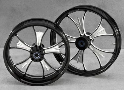 Roadliner/ Stratoliner Custom 'Midnight' Wheels - Rear Wheel Only. Star custom wheels represent the pinnacle of style and innovation and employ state-of-the-art engineering and manufacturing processes. Crafted in the U.S.A. to demanding standards for exceptional quality using 100% CNC-machined 6061 forged aluminum. Available in brilliant chrome or contrast black anodized/raw machined aluminum, Star custom wheels are a bold statement in the personalization of your ride. Pulley shown in inset image. All wheels come with bearings, seals, and valve stems installed. Metzeler 880 tires recommended. Wheel & Tire Specifications for Roadliner/Stratoliner: Front Rim Size: 18 x 3.5, Rear Rim Size: 18 x 5.5, Recommended Front Tire Size: 130/ 70-18, Recommended Rear Tire Size: 200/ 50-18. Give your bike a stylish, affordable upgrade by purchasing this high-quality, custom front wheel.