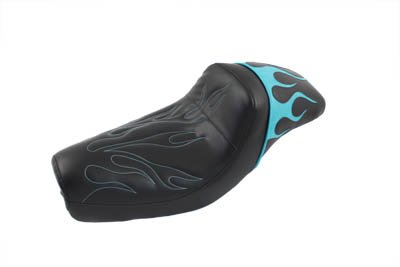 Aqua flame style gunfighter seat features sewn inlay of colored flames on rear pad area with matching flame stitch and thread in front driver area. Order bracket separately. Fits:XL 2004-2006 UOM: 1 - EA Style: Gunfighter 2011 Catalog pages: 961 Order #31-0653 bracket SAV for Harley Davidson Motorcycles