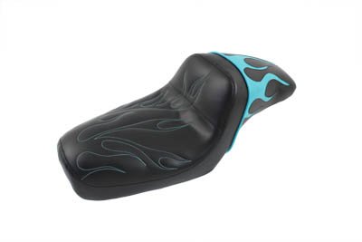 Aqua flame Gunfighter seat features a sewn inly of colored flames on the rear pad area with a matching flame stitch on the front driver area. Vinyl covers a high density molded foam for durability and comfort. Fits:XL 1979-2003 UOM: 1 - EA Style: Gunfighter 2011 Catalog pages: 961 SAV for Harley Davidson Motorcycles