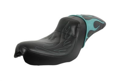 Aqua flame hustler gunfighter seat features sewn inlay of colored flames on rear pad area with matching flame stitch and thread in front driver area. Molded high density foam provides comfortable riding and driver back support. Fits:XL 1952-1978 UOM: 1 - EAStyle: Gunfighter 2011 Catalog pages: 864 SAV for Harley Davidson Motorcycles