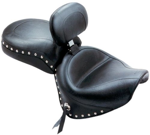 These seat assemblies are sold as a complete three-piece set including the rider solo seat, a removable driver backrest and matching passenger seat. The built-in driver backrest offers more features than any other backrest on the market like tool-less removal, a knurled thumb screw for easy adjustment and a large 12" contoured backrest pad for comfort. The deeply pocketed driver's seat is 17" wide and sits you at the ideal cruising angle. The comfortable passenger seat is 13" wide and fully supported by Mustang's unique internal steel support wings. Sleek styling desgins to compliment the lines of the Road Star. Available in either Vintage (plain) or studded designs.