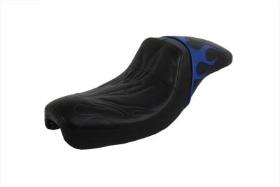Blue flame style gunfighter seat features sewn inlay of colored flames on rear pad area with matching flame stitch and thread in front driver area. Order bracket separately. Fits:XL 2004-2006 UOM: 1 - EA Style: Gunfighter 2011 Catalog pages: 961 Order #31-0653 bracket SAV for Harley Davidson Motorcycles