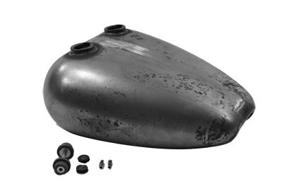 Gas tank is dual cap style with a left side petcock, and a fuel capacity of 4.2 gallons. Paughco gas tanks are shipped "raw" and may have oxidation which must be sanded off then coated with primer prior to painting. Tanks use 1975-up petcock with external thread for nut. Tank is rubber mounted style. Check the tank for flaws and fit before painting. Do not grind or sand the seams or joints. Clean the inside of the tank. It is suggested to pressure test and use a tank sealer. We suggest using Kreem gas tank combo kit to clean, condition, and seal to help stop leaks and prevent corrosion. Check petcock opening, making sure the petcock can be easily installed. Petcock fitting should be masked or plugged during painting for easy installation of petcock. Fits:XL 1995-2003 UOM: 1 - EA Style: Porkster 2011 Catalog pages: 944 Measurements Top Length: 19" Bottom Length: 16" Rear Width: 7" Front Width: 13" Rear Height: 4" Front Height: 8" Front Tunnel Height: 4" Rear Tunnel Height: 1-1/2" Tunnel Length: 19" SAV for Harley Davidson Motorcycles